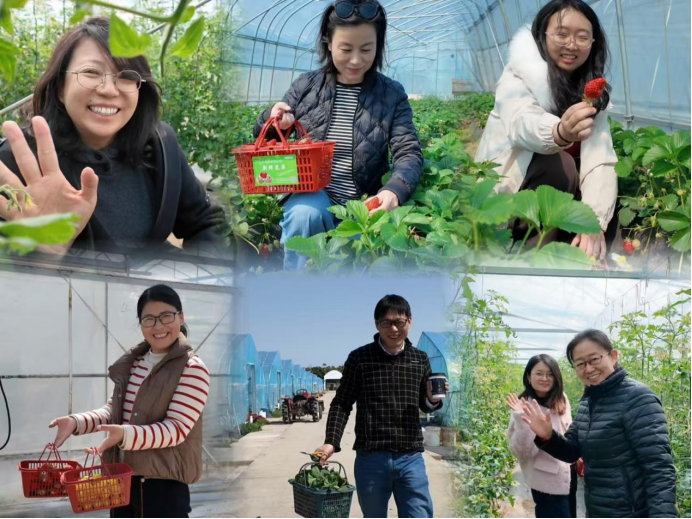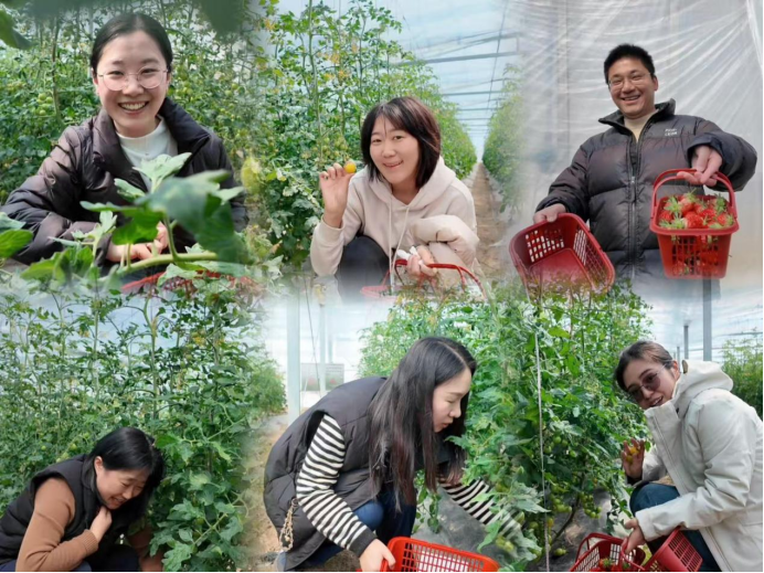 一踏入生机勃勃的采摘园,老师们便被满眼的春色吸引。大家手提果篮,兴致盎然地穿梭在田垄之间,亲手采摘下鲜红欲滴的草莓和圆润饱满的小番茄。平日里在讲台上严谨认真的老师们,此刻在轻松惬意的氛围中,一边分享着收获的喜悦,一边交流着工作与生活的点滴,欢声笑语在田间地头久久回荡。此次活动让女教职工们暂时放下了繁忙的教学科研工作,在亲近自然、亲手采摘的过程中,有效舒缓了压力,增进了彼此间的情谊。